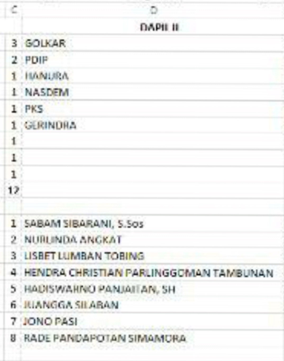 Salah satu caleg terpilih adalah Drs. Bona Hasudungan Sitindaon caleg dari dapil I yg diusung oleh Partai Demokrat. Adapun caleg terpilih dari dapil Dairi I adalah sebanyak 12 orang, yaitu seperti tabel berikut ini: