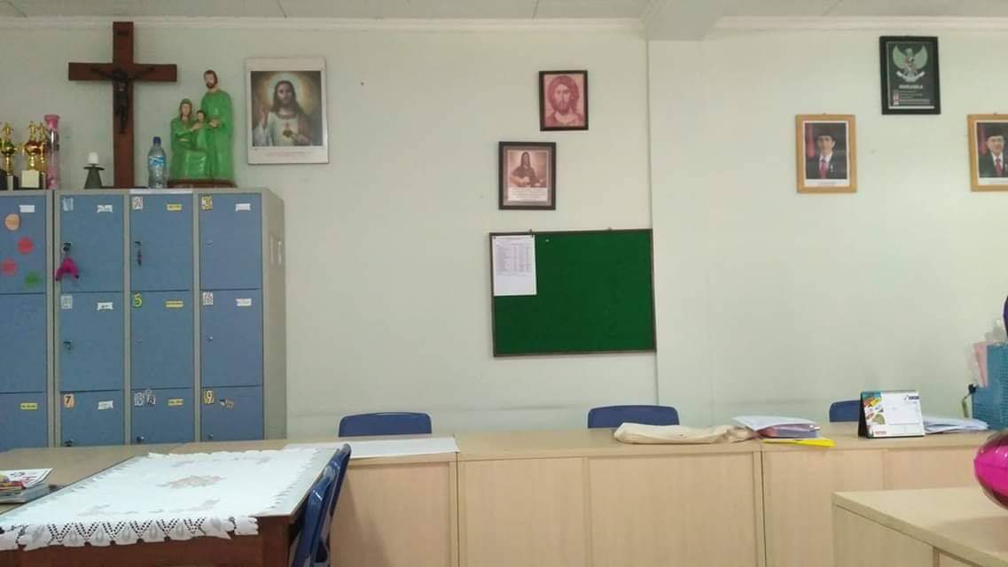 Seperti yang gw bilang gw ngajar di Sekolah Katolik sedangakan gw adalah Muslim (Insya Allah). Difoto yang gw post disini adalah ruang guru dan disitu ada meja gw. Depan meja gw persis penuh dengan patung Yesus dan Bunda Maria (salam atas mereka) dan tak lupa juga ada salib dengan ukuran sedang.