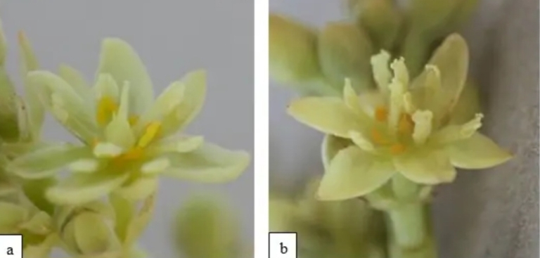 Ciri-ciri bunga mekar pada tanaman alpukat. a) Bunga mekar tahap pertama (sebagai bunga betina). b) Bunga mekar tahap kedua (sebagai bunga jantan)